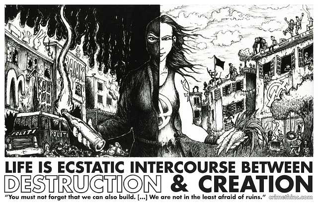Throughout much of the later 20th century, the global squatting movement was one of the chief lines of transmission via which anarchism was passed from one generation to the next, literally subsisting in the ruins. If anarchist ideas are spreading to new demographics today, it is partly thanks to the efforts of those generations of squatters and eco-saboteurs, to whom we dedicate this poster.