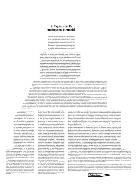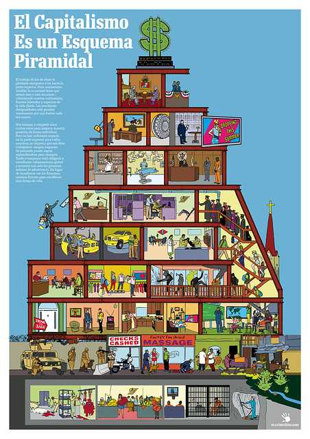 El trabajo de los de abajo la pirámide enriquece a los hacía la parte superior. Para mantenerse estable, la economía tiene que atraer más y más recursos—colonizando nuevos continentes, fuerzas laborales y aspectos de la vida diaria. Las resultante desigualdades sólo pueden mantenerse por una fuerza cada vez mayor.