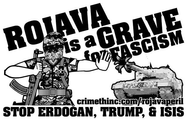 This is not the first time that the revolutionary experiment in Rojava has confronted these same forces. In solidarity, we prepared an updated version of our previous poster supporting the struggle against Recep Tayyip Erdoğan, Donald Trump, and the Islamic State. This new version presents a link to an analysis from American, Chinese, and Russian anarchists who have fought to defend Rojava, discussing the situation in February 2026.